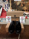 The 4 hole shoes have a rounder toe box, are finished in a Black waxy leather and have a dyed red sole and stitching too match.